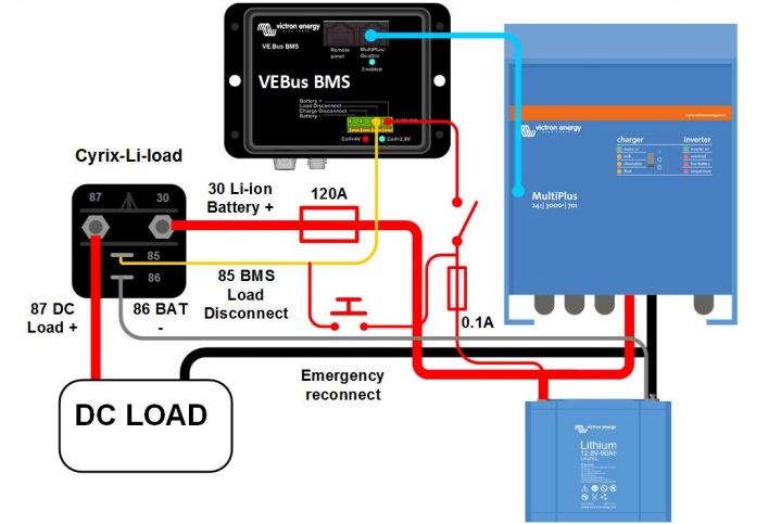 Cyrix-Li-load se vypne, když jeho řídicí vstup nebude napájen. Pokud se napětí baterie zvýší po odpojení (což se stane, když nejsou k baterii připojeny žádné další zátěže), výstup BMS se zapne a Cyrix se po 30 sekundách znovu zapne. Po 3 pokusech o opětovné zapnutí zůstane Cyrix odpojen, dokud napětí baterie nepřekročí 13V (resp. 26V nebo 52V) po dobu nejméně 30 sekund (což znamená, že se baterie dobíjí). Alternativně lze použít BatteryProtect (výhoda: velmi nízká spotřeba energie).