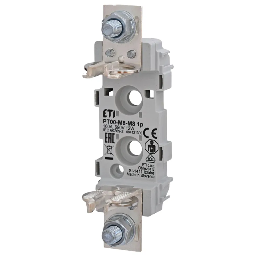 Plastový pojistkový spodek PT 00 M8-M8 S, 1 pólový, In = 160A, Un = 690V, pro pojistky HN00 (000), montáž na panel / DIN lištu.