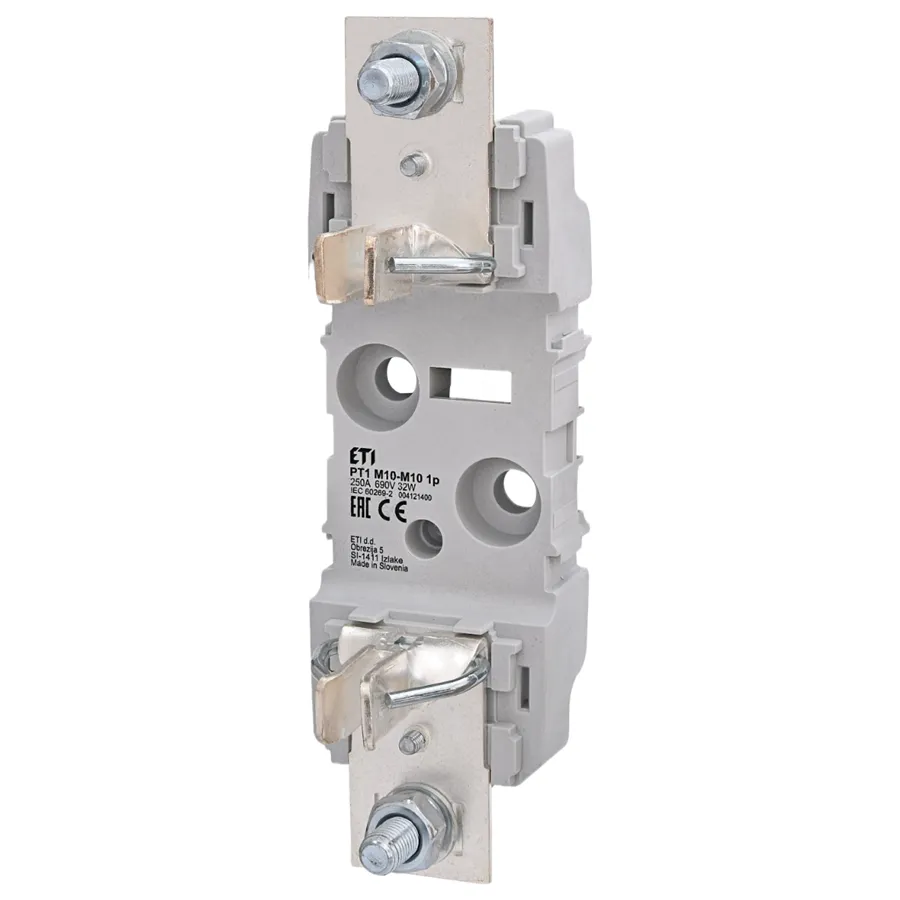 Plastový pojistkový spodek PT 1 M10-M10 S, 1 pólový, In = 250A, Un = 690V, pro pojistky HN1, montáž na panel / DIN lištu.